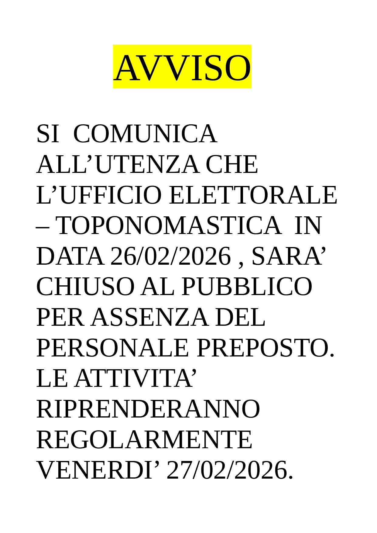 Si comunica all'utenza l'Ufficio ELETTORALE- TOPONOMASTICA, domani Giovedì 26/02/2026 resterà chiuso al pubblico per assenza del personale preposto e che l'attività riprenderà regolarmente Venerdì 27/02/2026 dalle ore 09:30 in poi.